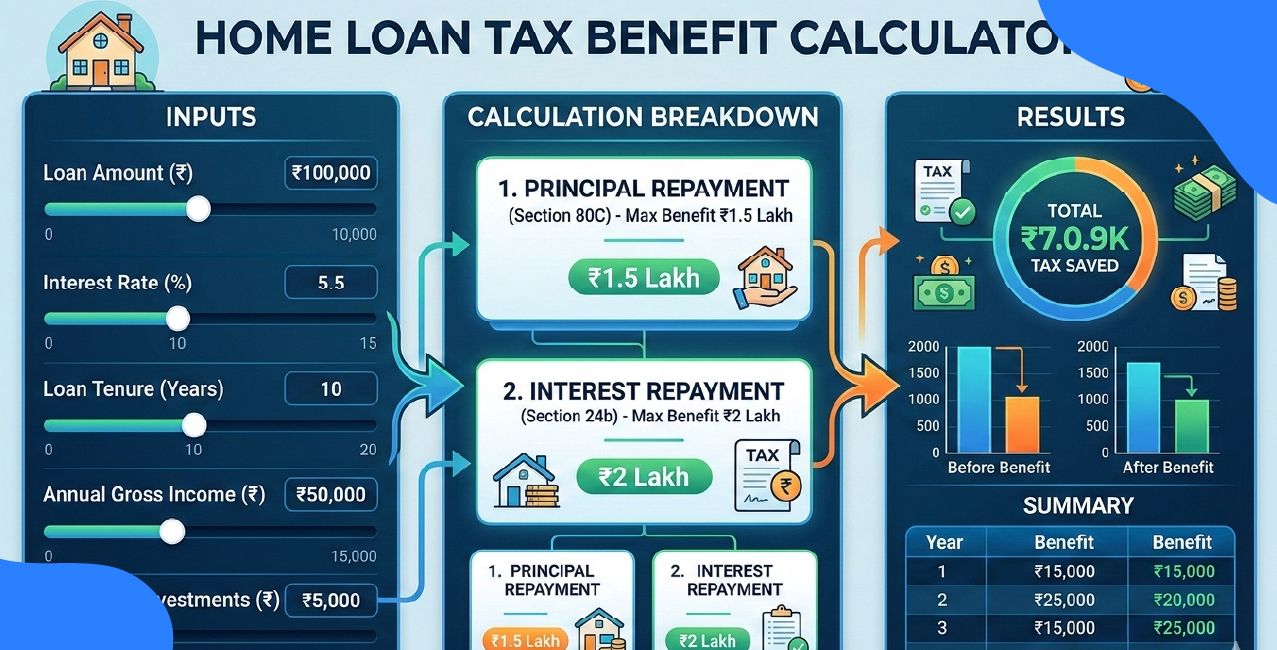A home loan tax benefit calculator is an online tool that estimates the amount of income tax a borrower can legally save by taking out a home loan. The calculator converts loan details into tax savings by applying limits defined by the Income Tax Act. This makes tax planning easier and more accurate for borrowers when using a home loan tax benefit calculator India.
