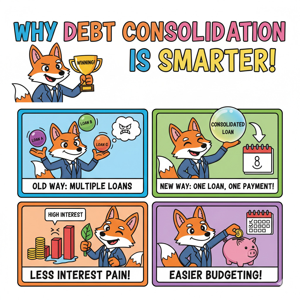 Debt consolidation means combining multiple loans or credit card dues into one single loan with one monthly EMI. It helps reduce interest burden and makes repayment easier to manage.