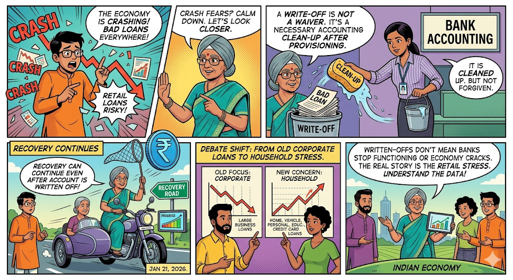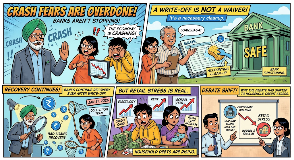 A write-off is not a waiver. It is an accounting clean-up after a loan has already turned bad and been provided for. Recovery can continue even after the account is written off, as explained by LoansJagat, published on January 21, 2026. So, write-offs by themselves do not mean banks suddenly stop functioning or the economy is about to crack.