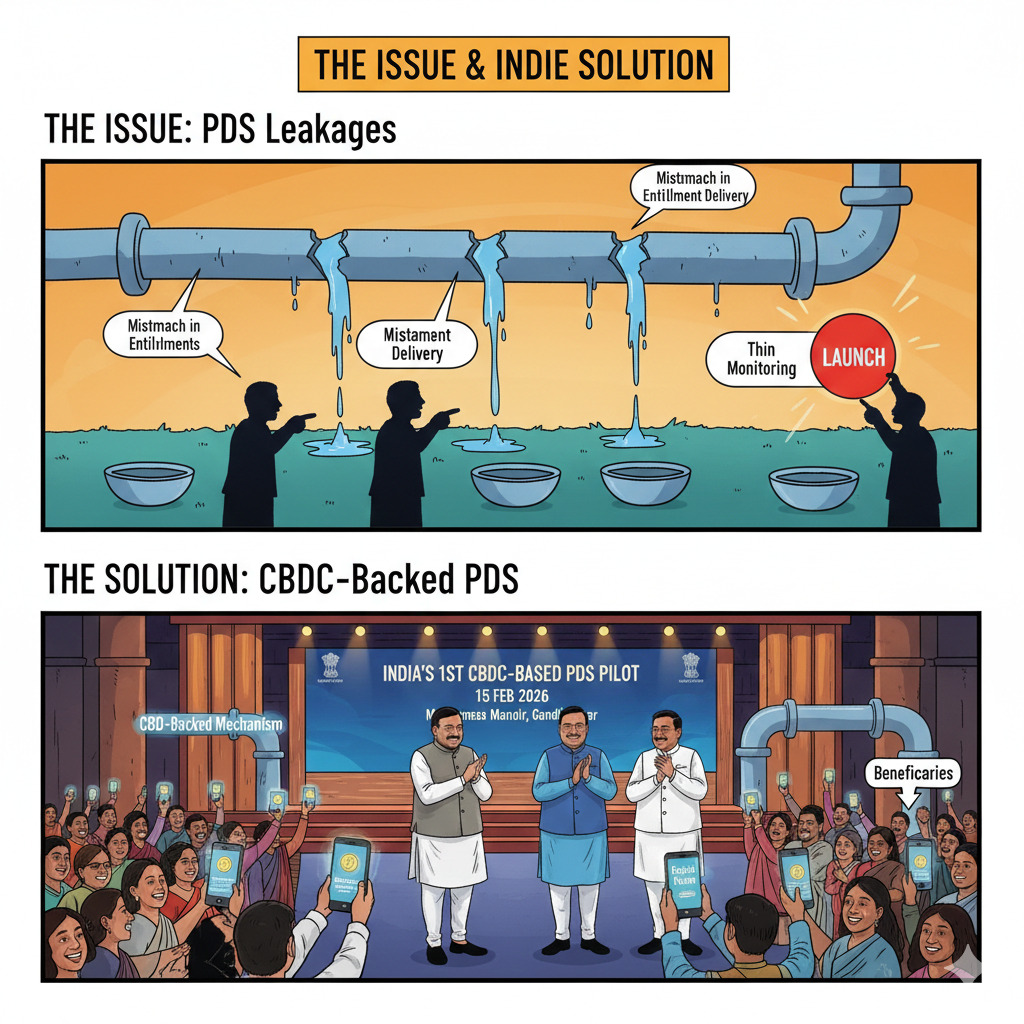 On 15 Feb 2026, Amit Shah launched a CBDC-based PDS pilot in Gujarat, covering 26,333 families, using digital tokens to tighten subsidy delivery and tracking.