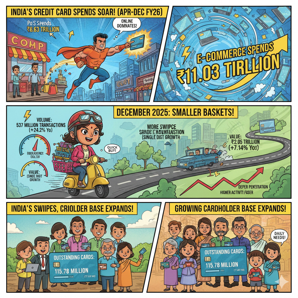 Credit card spending in India climbed 13.57% YoY to ₹17.65 trillion during April-December FY26, up from ₹15.54 trillion a year ago, as per a Business Standard report updated on January 27, 2026.