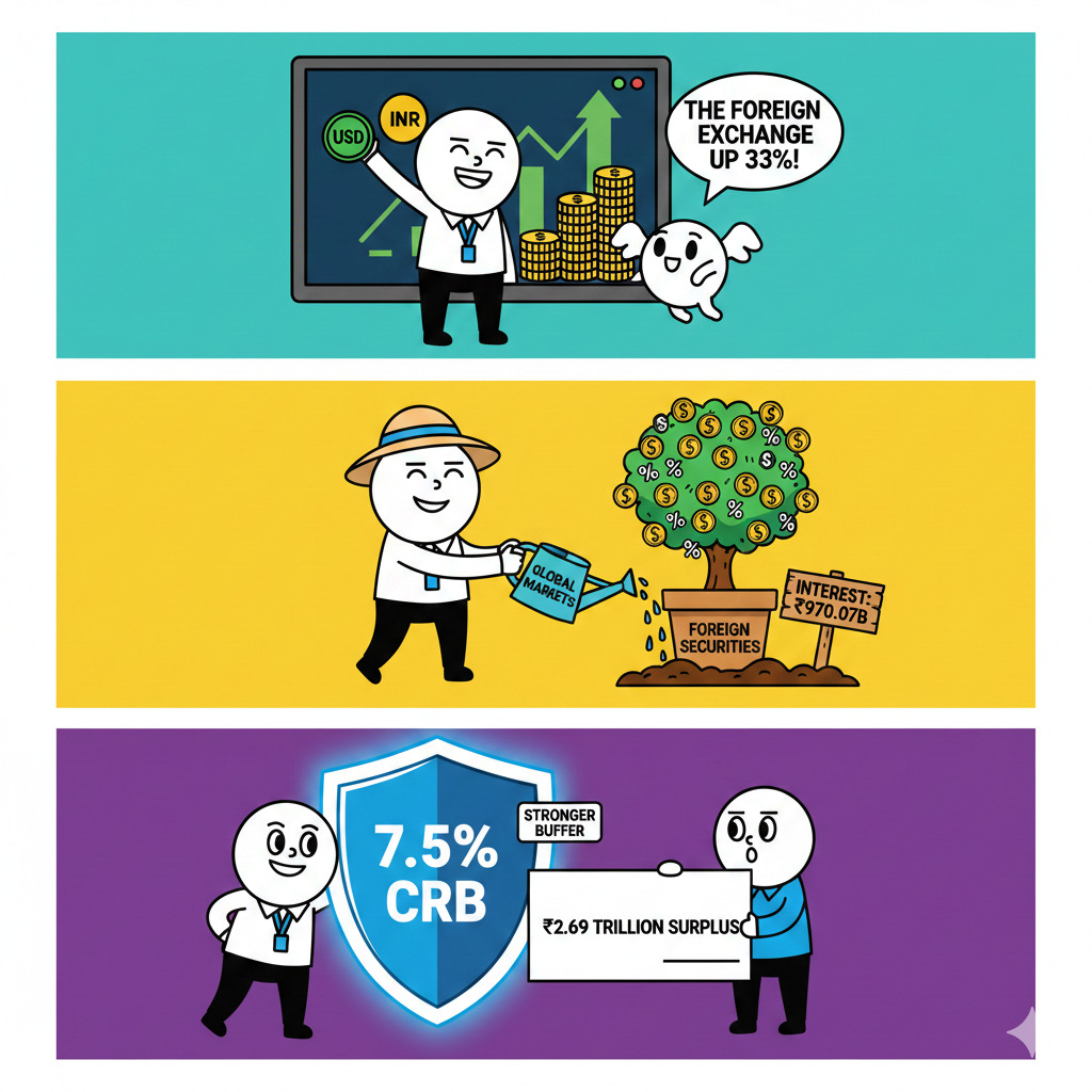 The FY25 surplus spike was largely powered by foreign exchange operations and interest income. Reuters reported gains from foreign exchange transactions rose 33% to ₹1.11 trillion, while interest income from foreign securities increased to ₹970.07 billion.