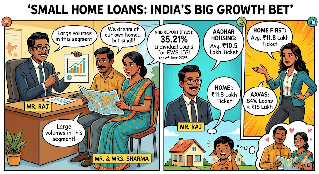 Specialist lenders show how small these loans are on the ground. Aadhar Housing Finance reported an average ticket size of ₹10.5 lakh, Home First reported ₹11.8 lakh, and Aavas said 84% of its active loans were below ₹15 lakh.