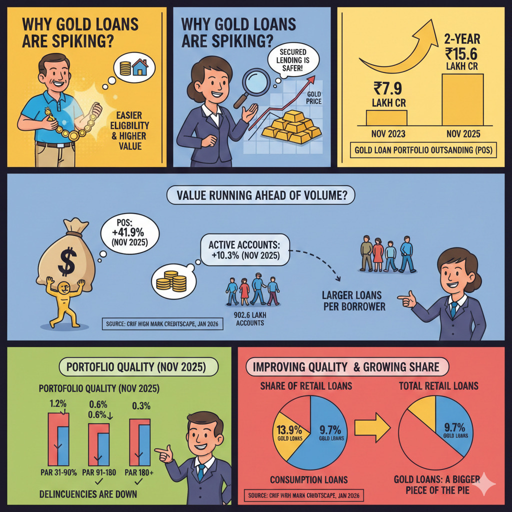 Gold loans are also taking a bigger share in the wider retail pie. As of Nov 2025, they form 13.9% of total consumption loans and 9.7% of total retail loans by POS, with consumption loans at ₹1,12,20,000 crore and retail loans at ₹1,60,00,000 crore. All of this is laid out in the January 2026 CreditScape report.