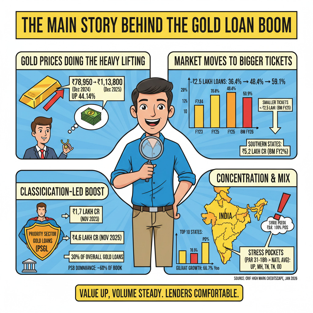 Gold loans are rising fast because gold prices are high and ticket sizes are getting bigger. The next print will depend on price trends, lender discipline, and borrower repayment comfort.