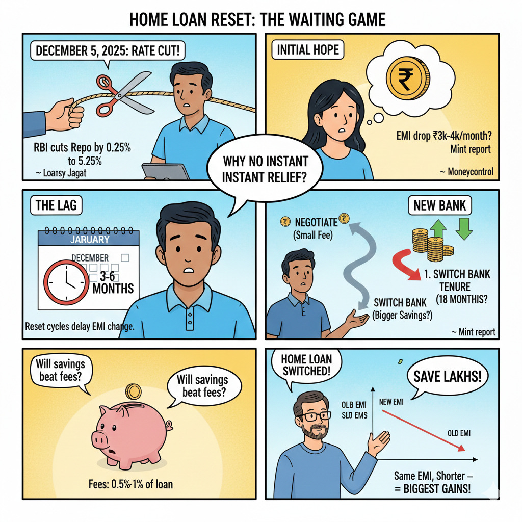 On the borrower side, mint December 10, 2025 report quoted investment advisor Shankar K advising borrowers to wait 3 to 6 months for transmission, and then consider next steps if the lender has not reduced rates or tenure. Loans Jagat January 11, 2026 explainer also nudges borrowers to track reset dates before assuming the cut is not reflected.