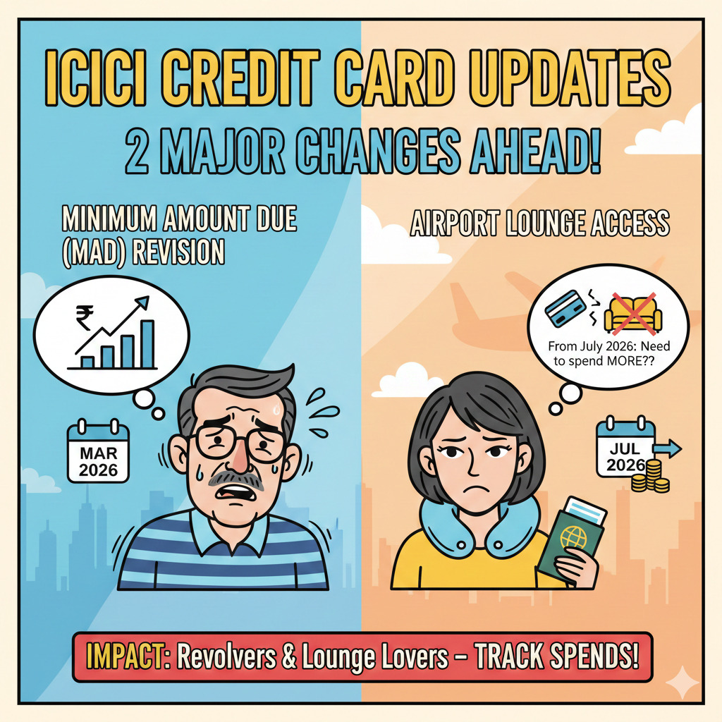 ICICI Bank is tightening credit card rules. Minimum Amount Due may rise from March 2026 statements, while lounge access gets a ₹75,000 quarterly spend gate.