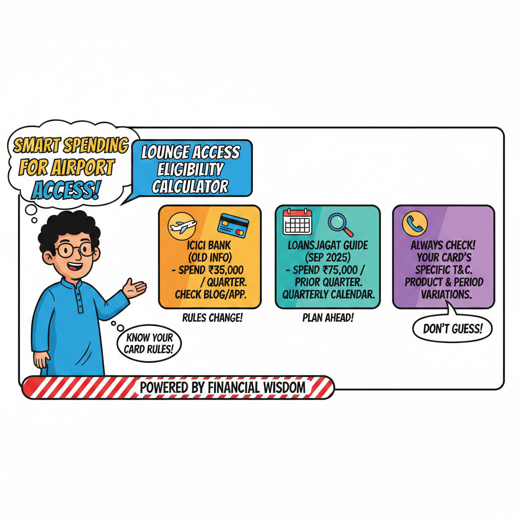 There is also visible variation across public explainers, which is why users must check their specific card terms. ICICI’s own blog page has referenced ₹35,000 per quarter as a lounge access spend figure in the past, reflecting that rules can differ by product or period. (Wise) Meanwhile, LoansJagat guide, dated Sep 23, 2025, details the ₹75,000 prior-quarter spend trigger and shows a quarterly eligibility calendar approach for lounge access planning.