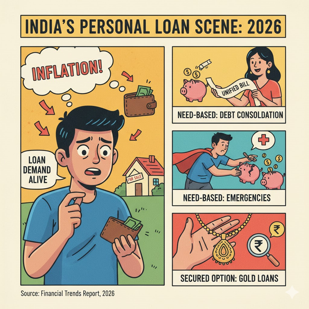 Inflation-led cost pressures are keeping personal loan demand elevated in 2026, but borrowing is shifting towards debt consolidation, emergencies, and secured options like gold loans.