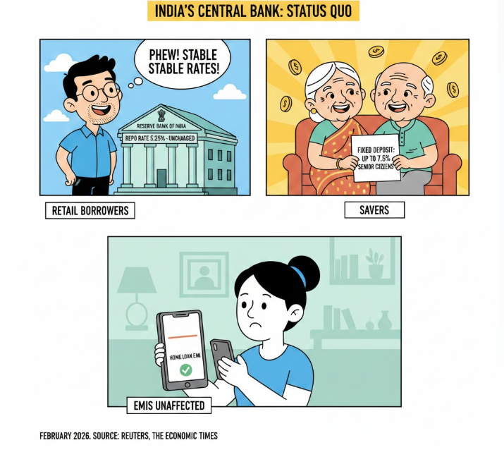 India’s central bank has opted for a status quo on interest rates in February 2026, holding the repo rate at 5.25% and retaining a neutral stance. For retail borrowers, that usually means no sudden movement in floating loan EMIs unless their bank resets the rate or changes the spread.