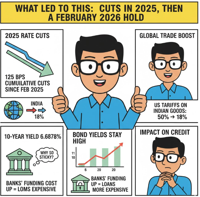 The pause keeps near-term EMIs predictable, but it does not guarantee cheaper loans quickly if yields stay elevated. For savers, the better play is comparing FD tenures and locking rates selectively while offers last.