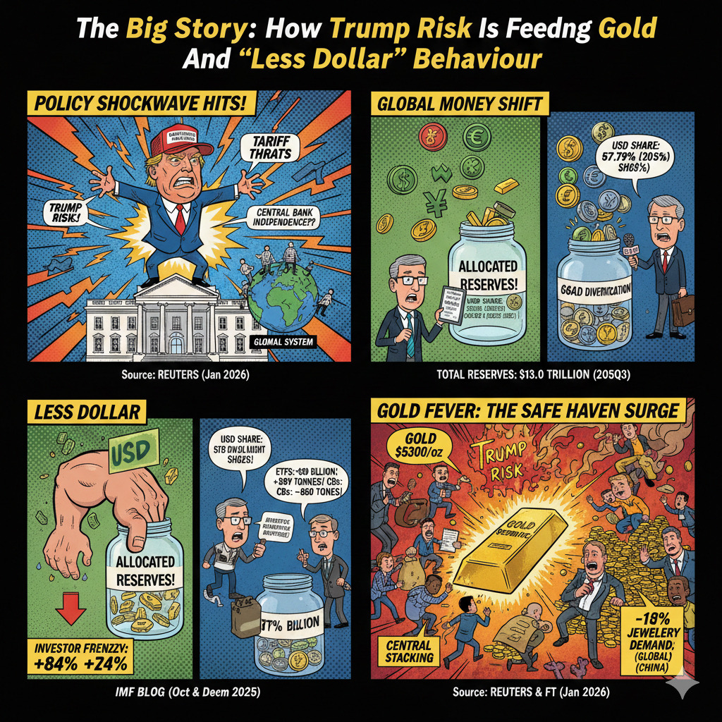 Gold’s rally is not just a price story. It is also a confidence story around the US-led financial system. As Donald Trump’s policy style returns to the centre of global risk pricing, investors and policymakers are factoring higher uncertainty around tariffs, sanctions and institutional stability.