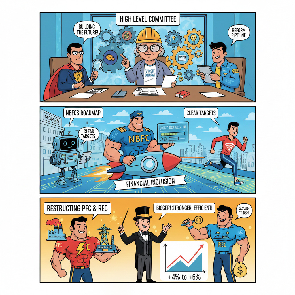 Third, it proposes restructuring Power Finance Corporation (PFC) and Rural Electrification Corporation (REC) as a first step to achieve scale and efficiency in public sector NBFCs. Markets reacted fast: reports noted PFC and REC rising about 4% to 6% after the proposal.