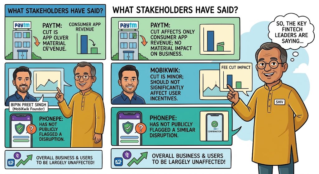 Paytm said the cut affects only consumer app revenue and will have no material impact on its overall business. Medianama quoted MobiKwik founder Bipin Preet Singh saying the cut is minor and should not significantly affect user incentives. PhonePe has not publicly flagged a similar disruption in these reports.