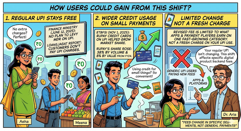 The first gain is simple: regular UPI stays free. The Finance Ministry said on June 12, 2025 that there is no plan to levy MDR on UPI transactions. LoansJagat, in a report dated August 20, 2025, also explained that customers do not pay UPI charges even when banks and payment aggregators debate backend costs.
